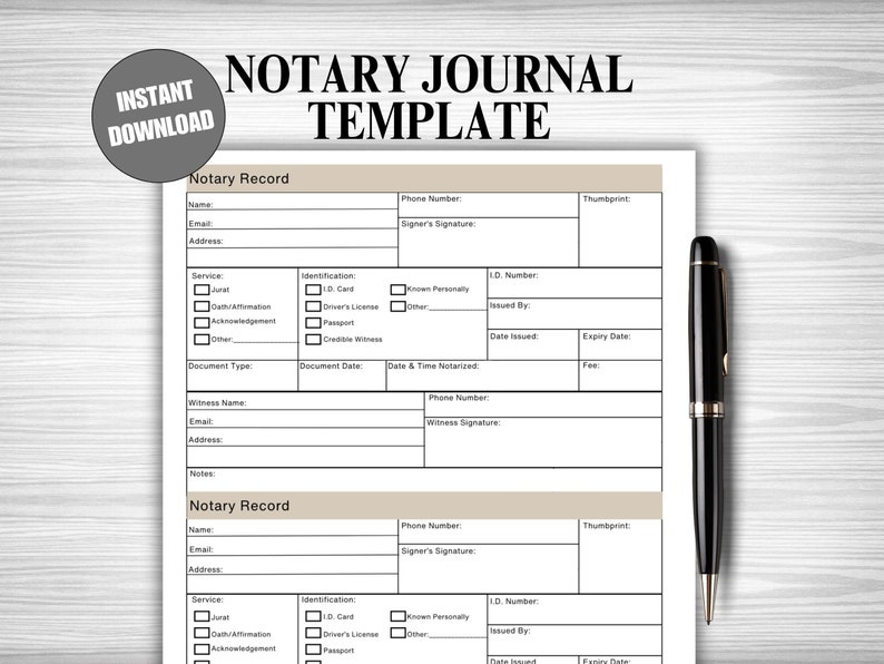 Notary Journal Template Notary Log Notary Record Printable Notary