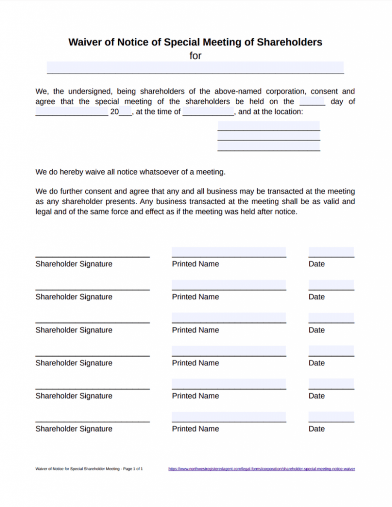 Waiver Of Notice Of Shareholder Meeting Template
