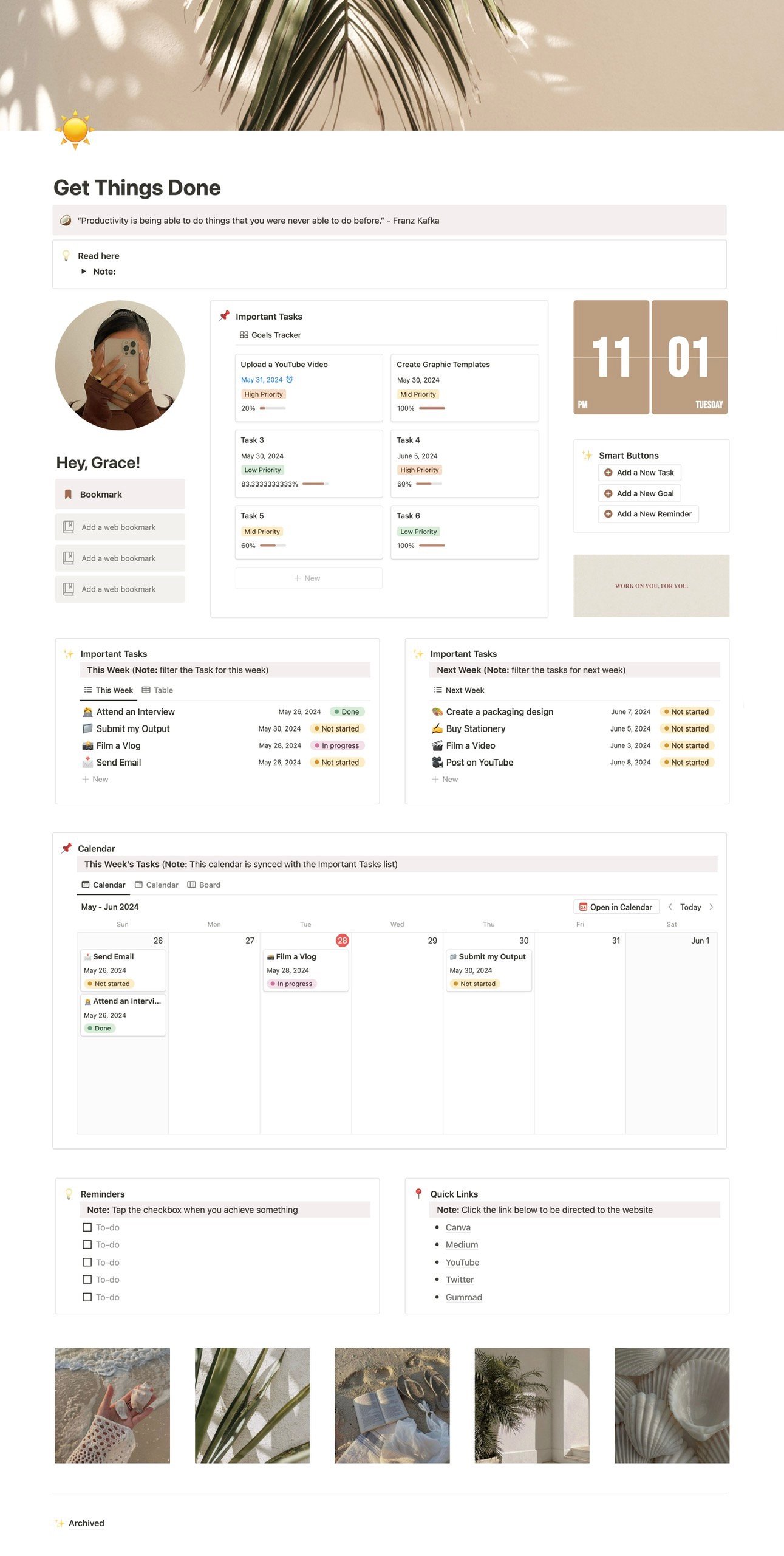Free Notion Aesthetic Dashboard GTD Get Things Done Template