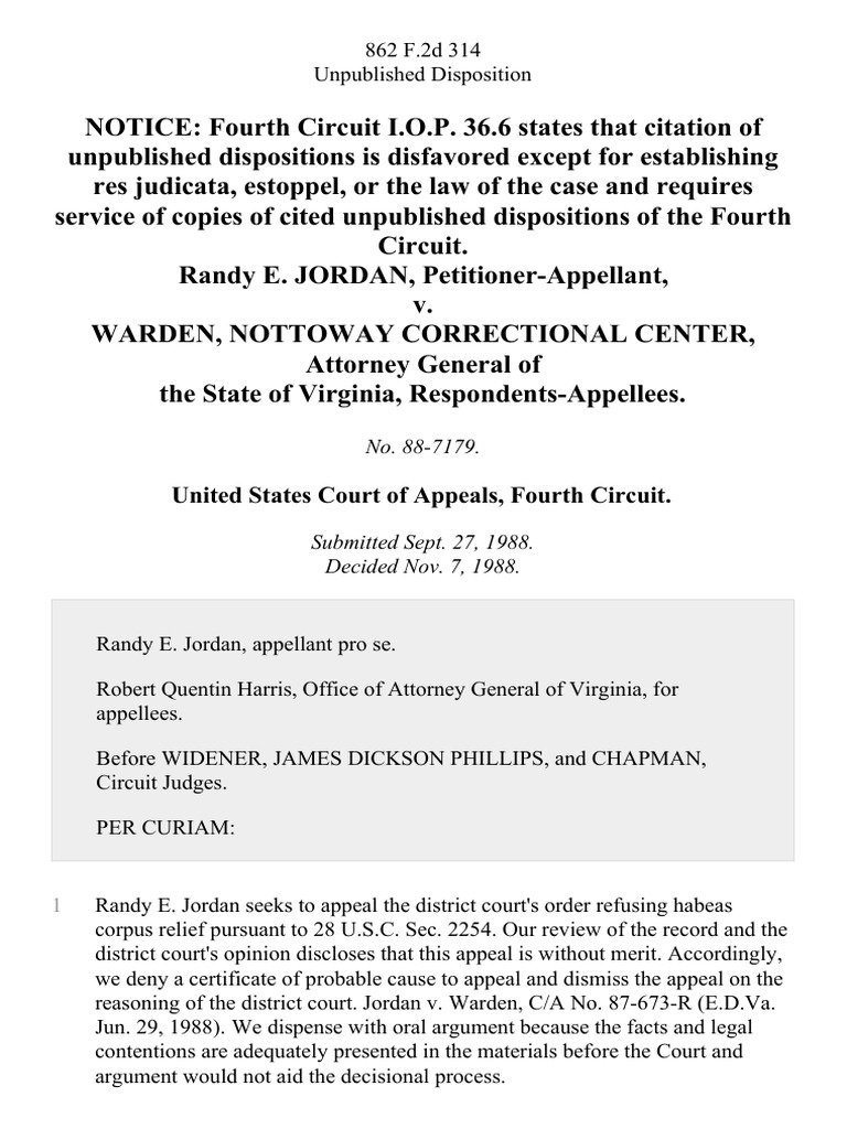 Randy E Jordan v Warden Nottoway Correctional Center Attorney