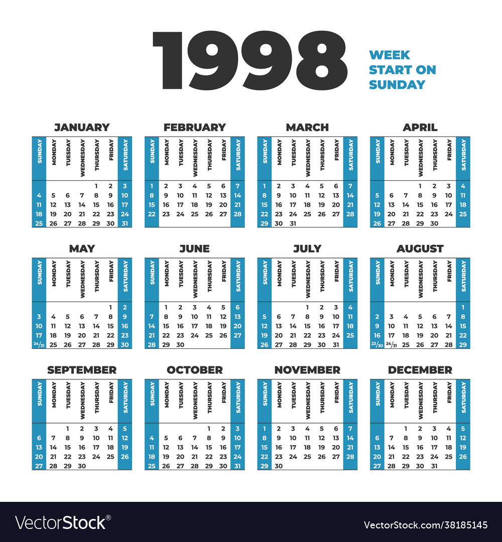 1998 year calendar weeks start on sunday Vector Image