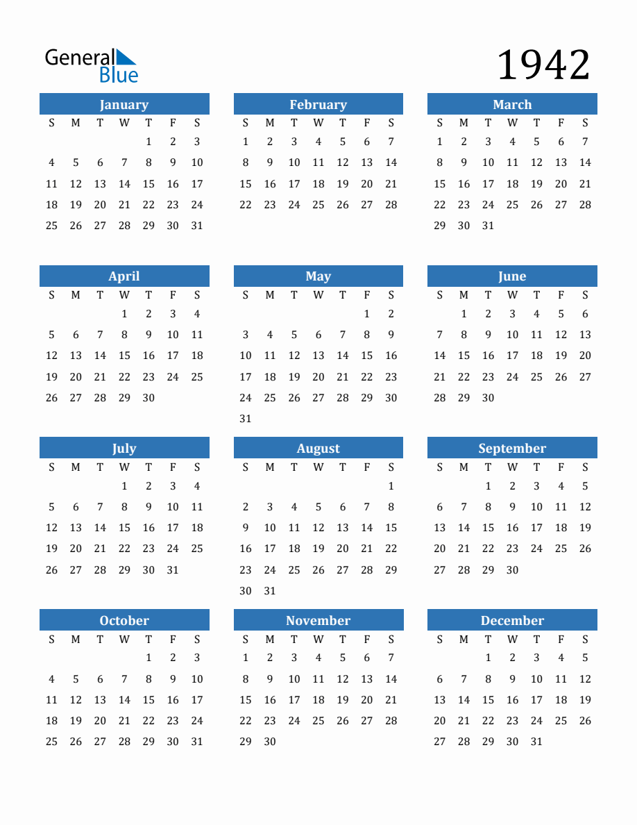 1942 Full Year Calendar
