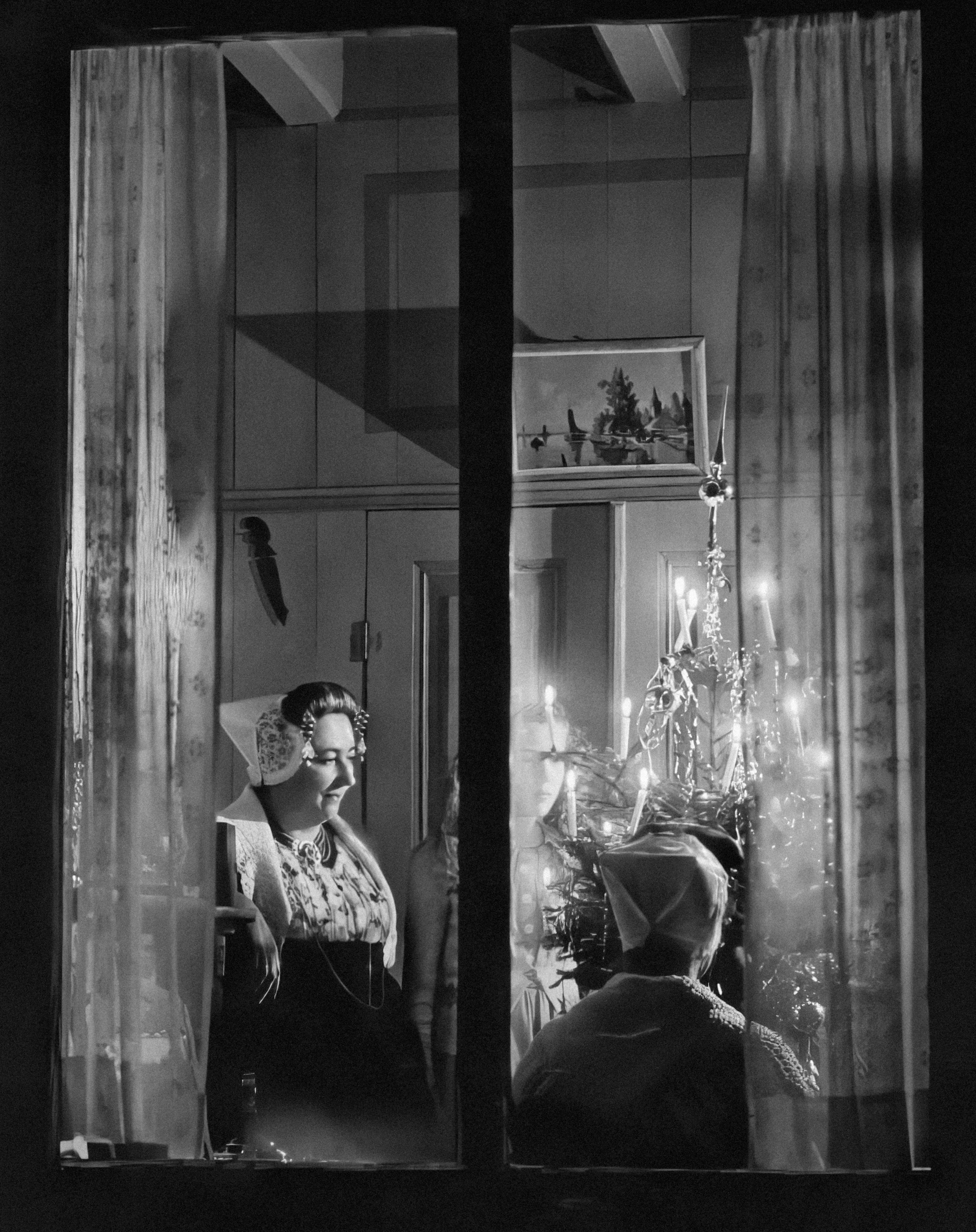 A black and white photo of a woman looking out a window photo Free