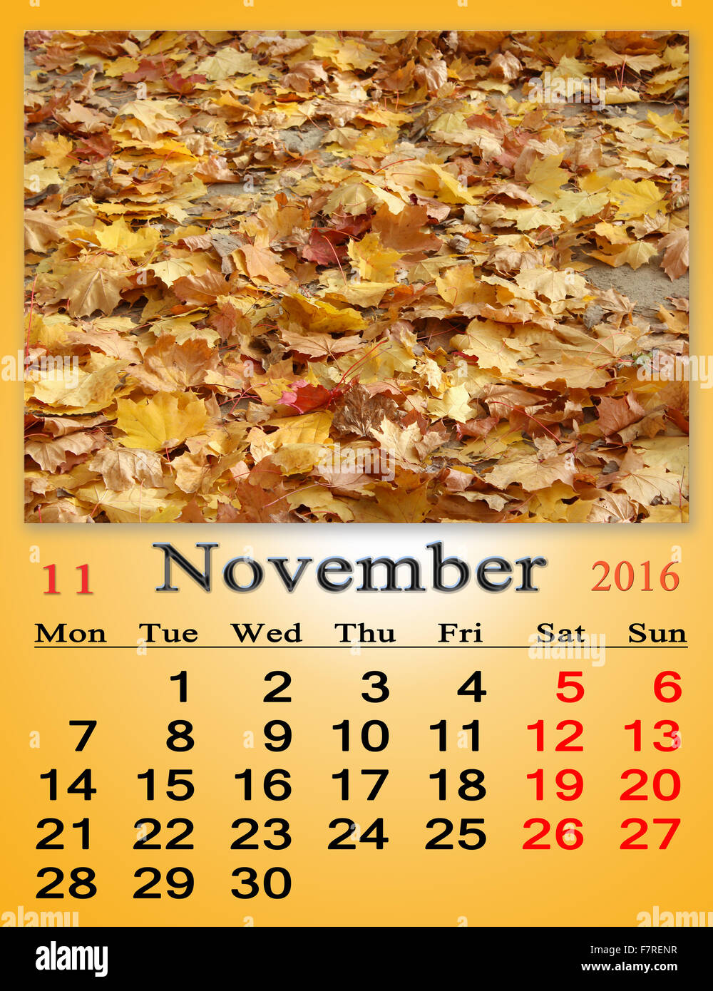 calendar for November 2016 with yellow leaves on the ground Stock Photo