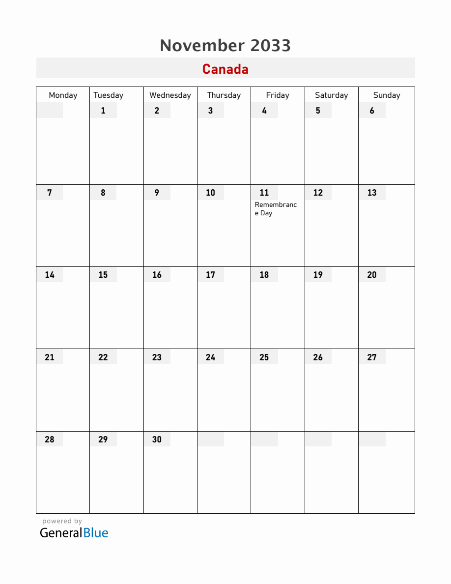 Canada November 2033 Calendar with Holidays
