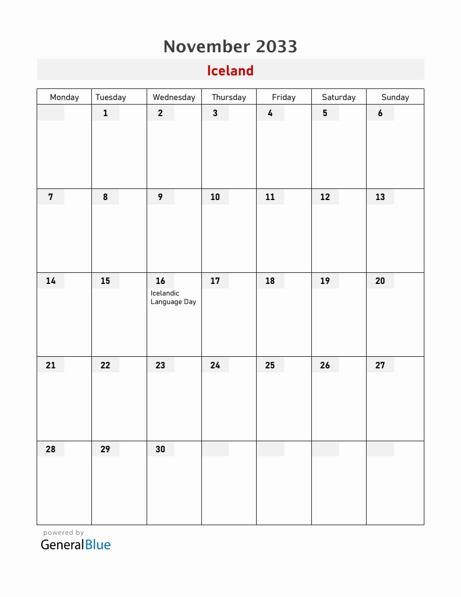 Iceland November 2033 Calendar with Holidays