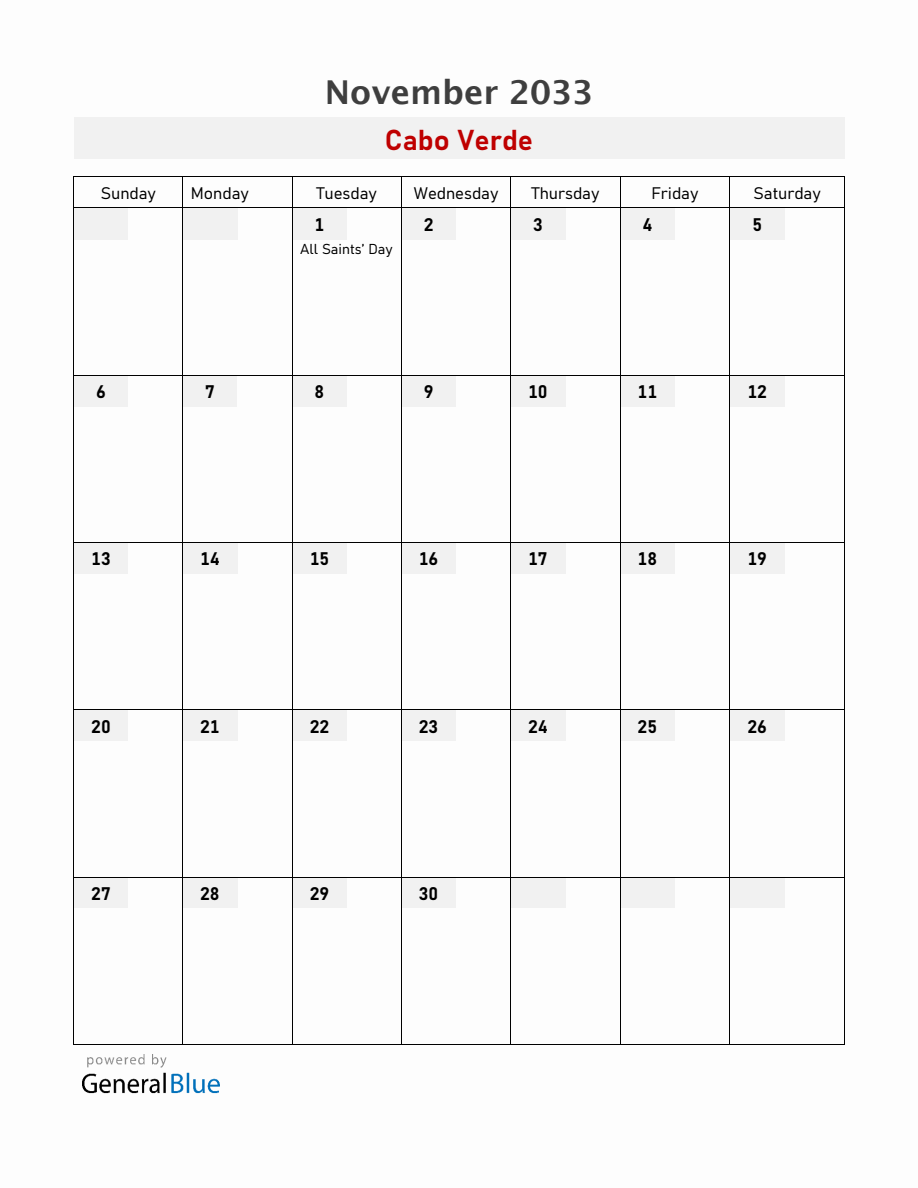 Cabo Verde November 2033 Calendar with Holidays