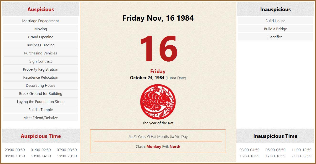 November 16 1984 Almanac Calendar: Auspicious/Inauspicious Events and