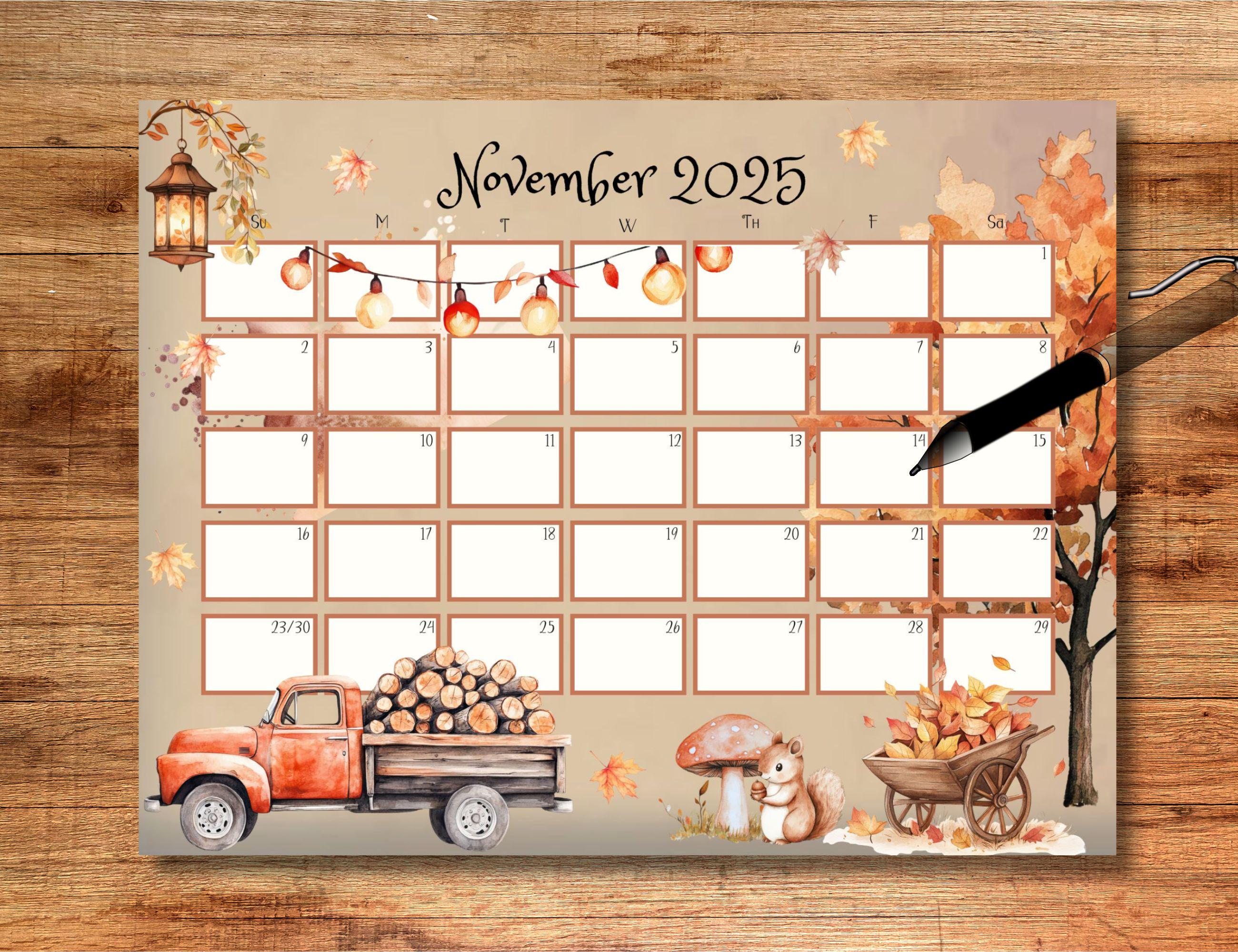 EDITABLE November 2025 Calendar Cozy Calendar Autumn Leaves