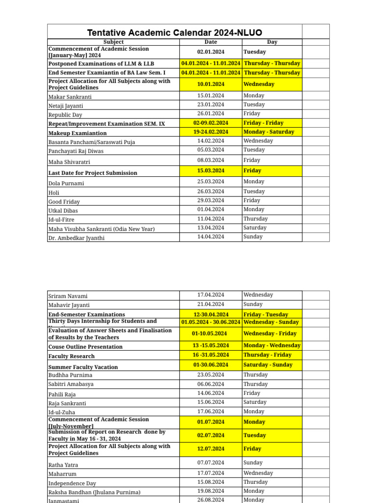NLUO Academic Calendar 2024 PDF Festival Religious Festivals