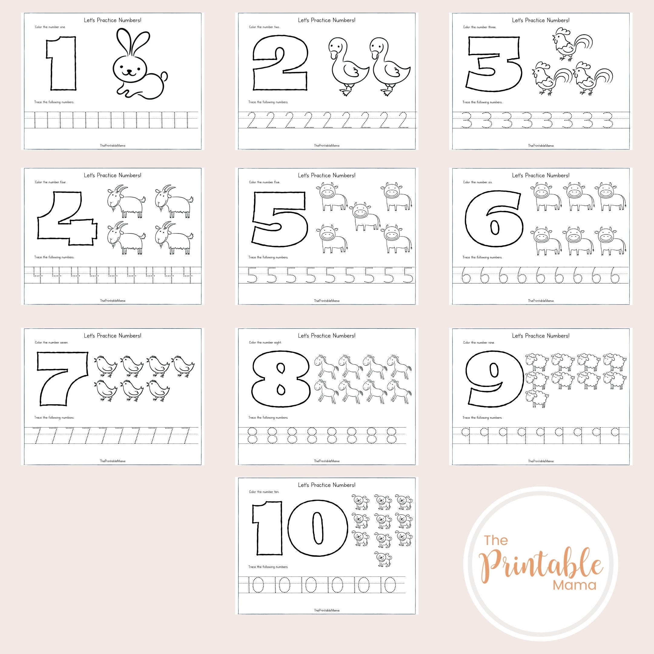 1 10 Numbers Printable Coloring Page Worksheets for Kids Toddlers