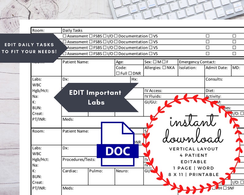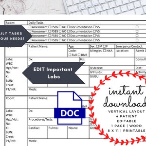 Med/surg 4 Patient Nurse Report Sheet Nurse Brain Editable Nurse