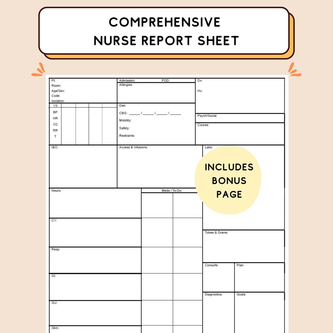 Nursing Report Sheet Nurse Brain Sheet Complete Assessment Etsy