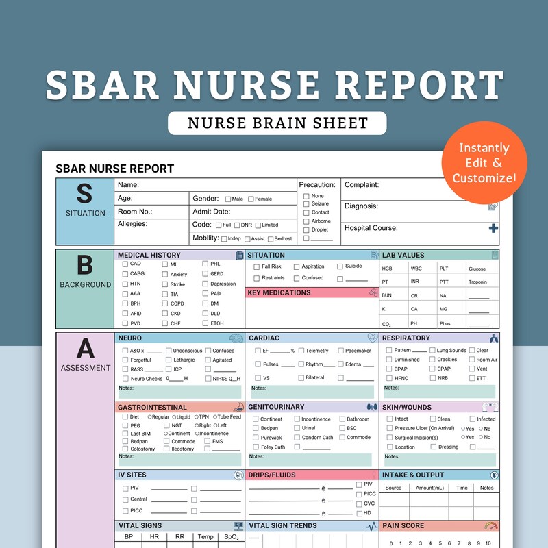 SBAR Nursing Report Sheet Med Surg Brain ICU RN Nurse Shift New Grad