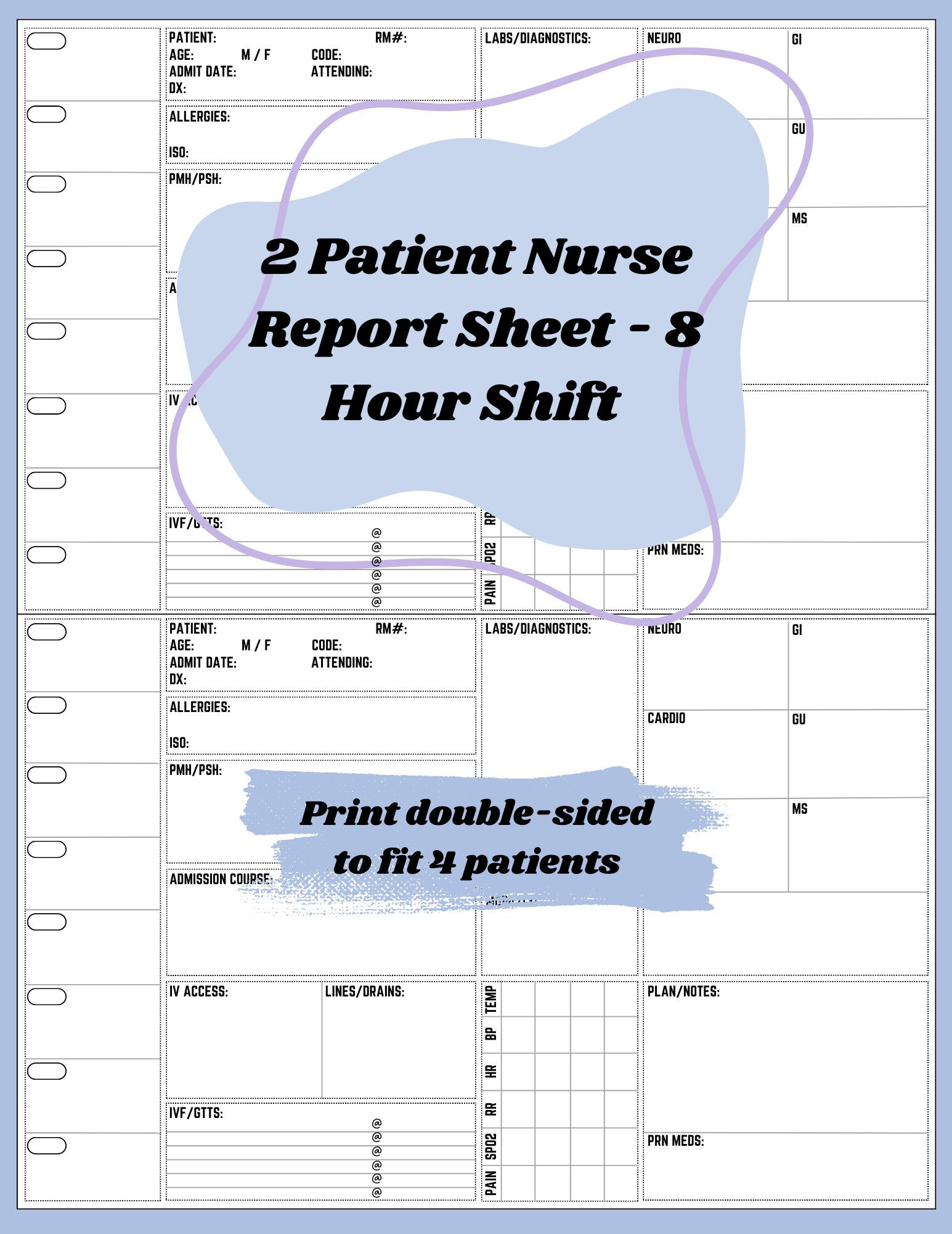 2 Patient Nurse Report Sheet (8 Hour Shift) Med Surg Med Tele ICU