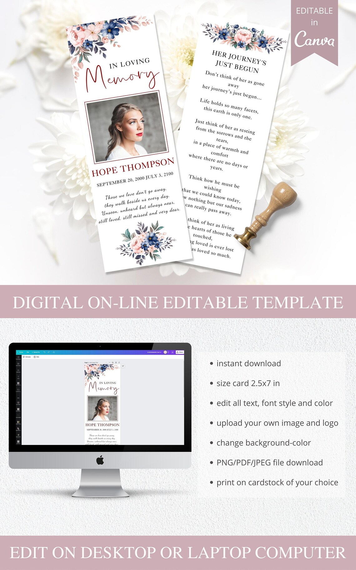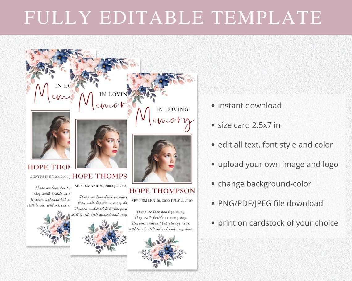 Funeral Bookmark Template Printable Memorial Bookmark Editable