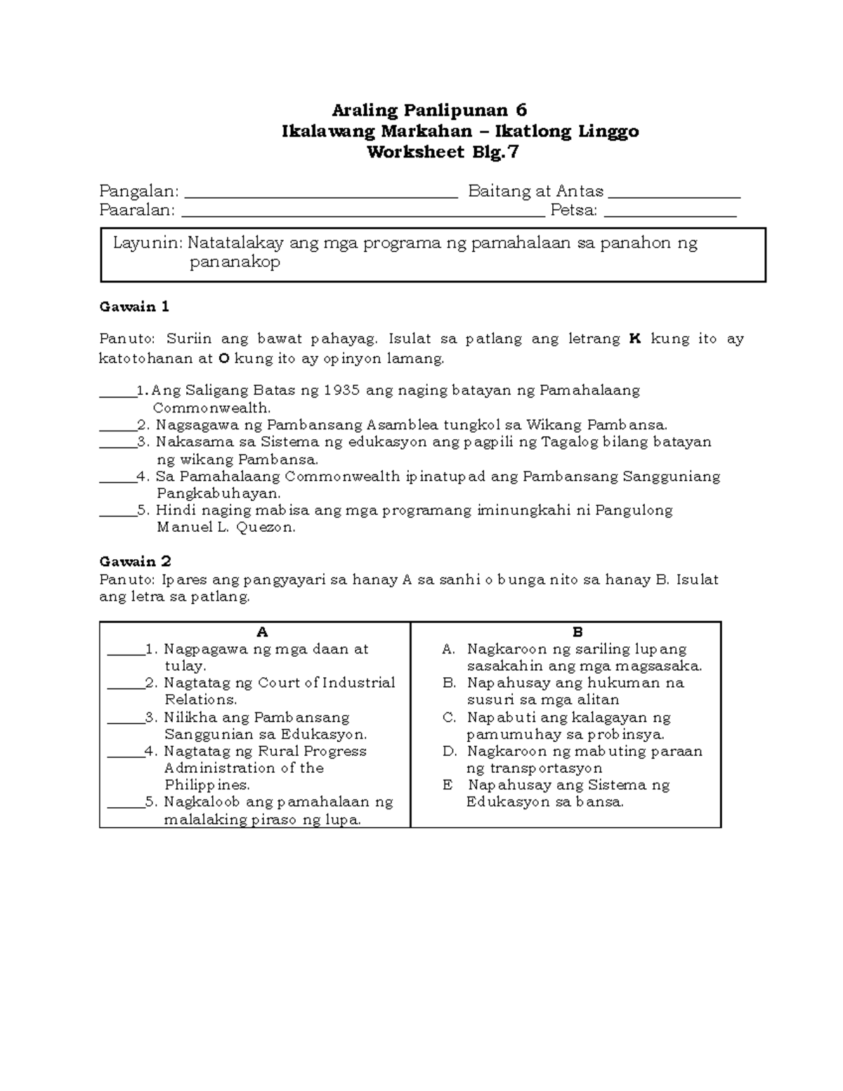 AP6 Q2 DW7 class Araling Panlipunan 6 Ikalawang Markahan Ikatlong