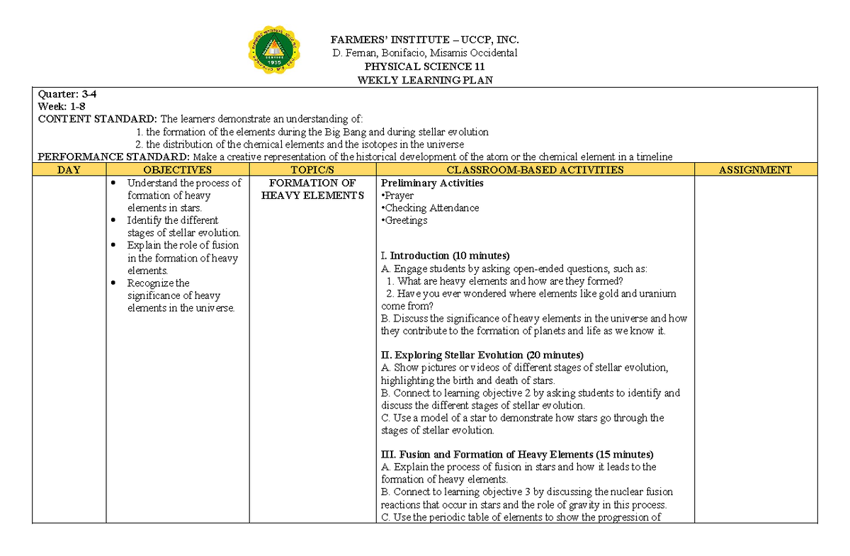 Physical science Q 2 3 FARMERS INSTITUTE UCCP INC D Fernan