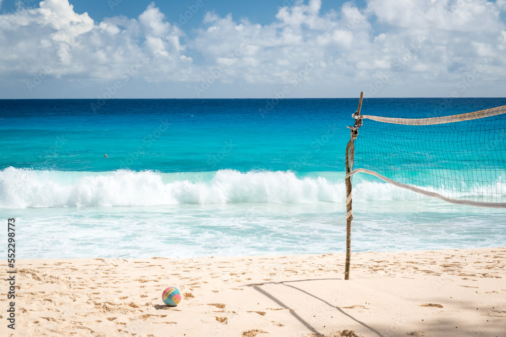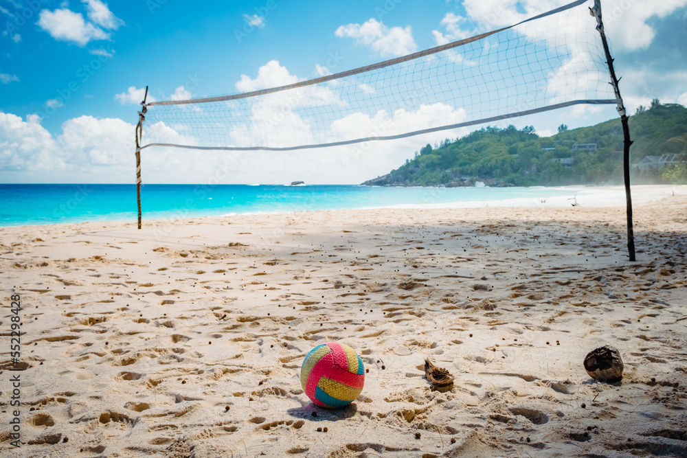 Volleyball net on tropical beach with blue sky Beach volleyball court