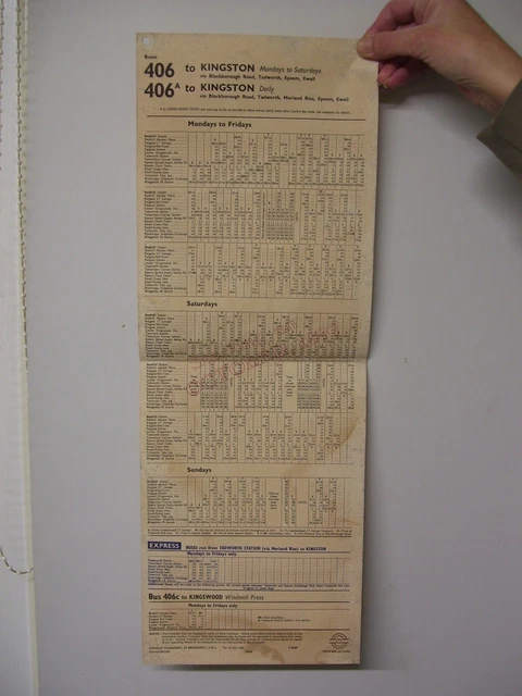 LONDON TRANSPORT BUS Stop Panel Timetable Routes 406 406A Oct 1967 Used