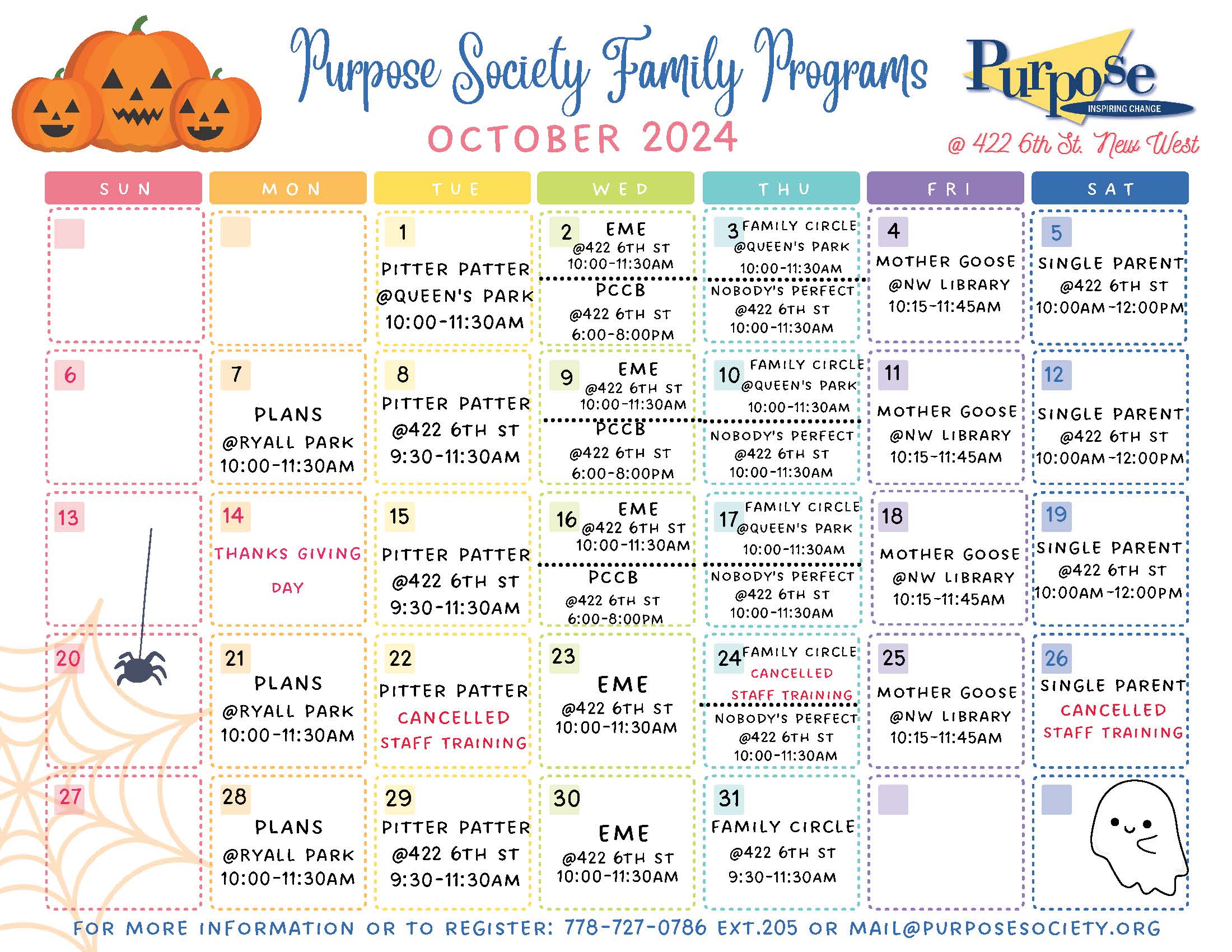 Oct 2024 Calendar Lower Mainland Purpose Society for Youth and Families