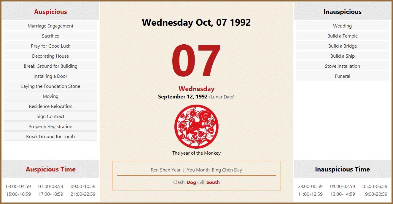 October 07 1992 Almanac Calendar: Auspicious/Inauspicious Events and