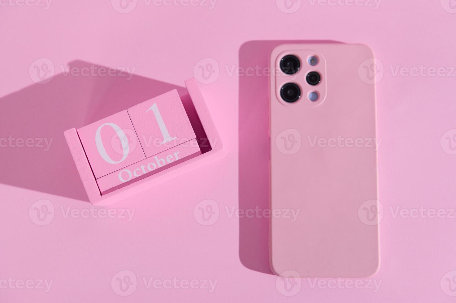 Minimalist pink phone and October 1st calendar on pastel background