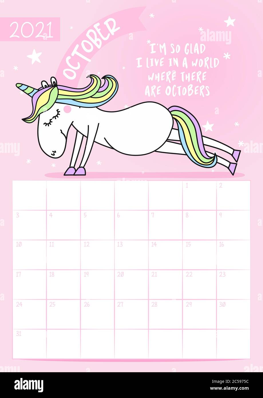 2021 October calendar with calligraphy phrase and unicorn doodle: quot I #39 m