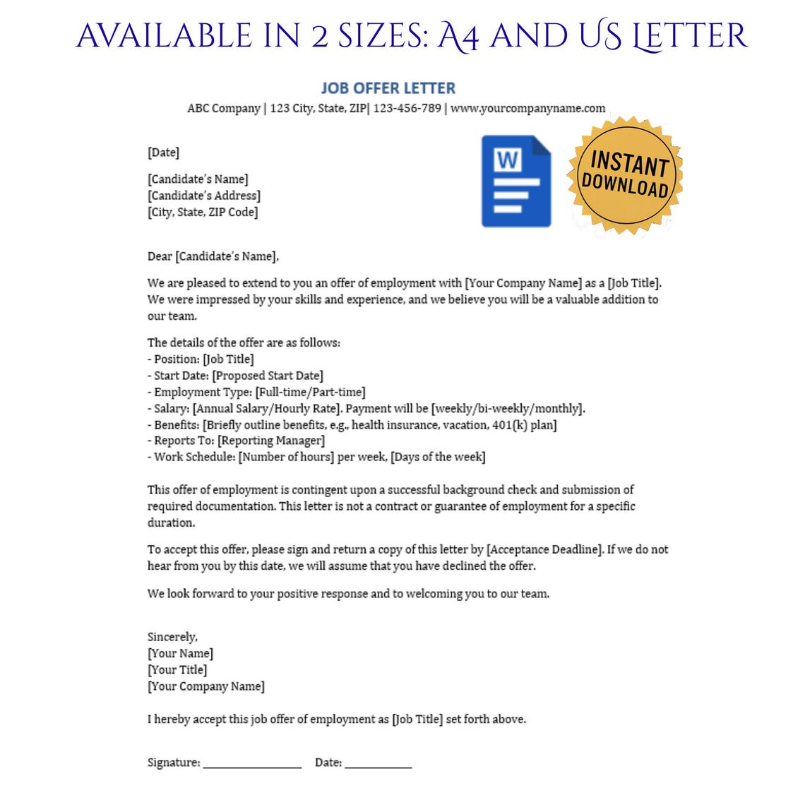 Editable Job Offer Letter Template: PDF Word Doc Etsy