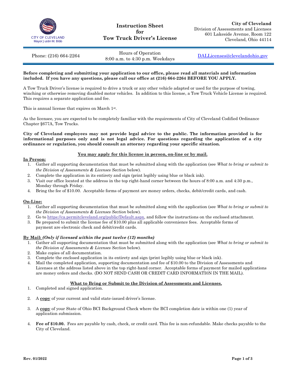 City of Cleveland Ohio Tow Truck License Application Fill Out Sign