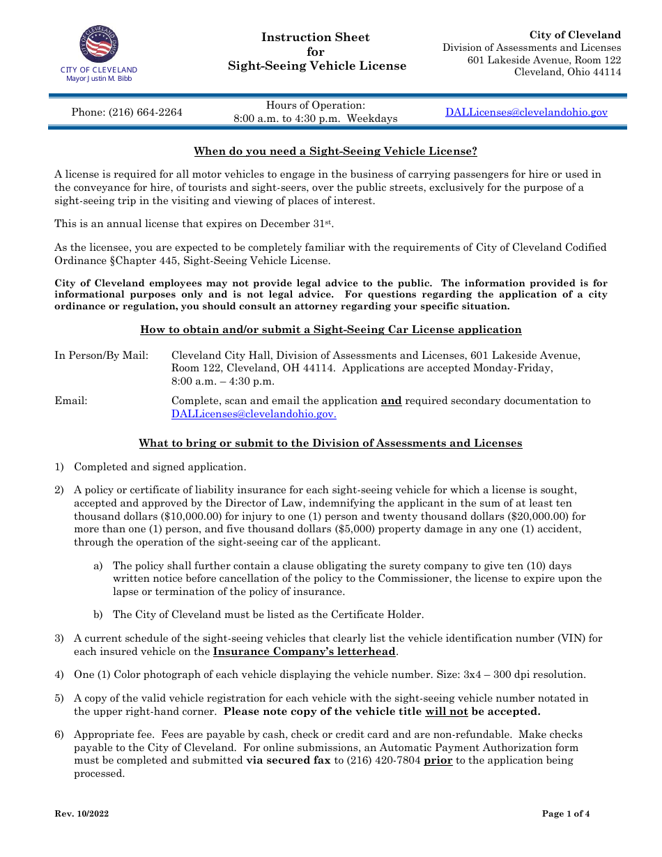 City of Cleveland Ohio Sight Seeing Vehicle License Application Fill