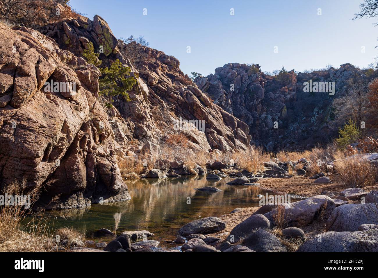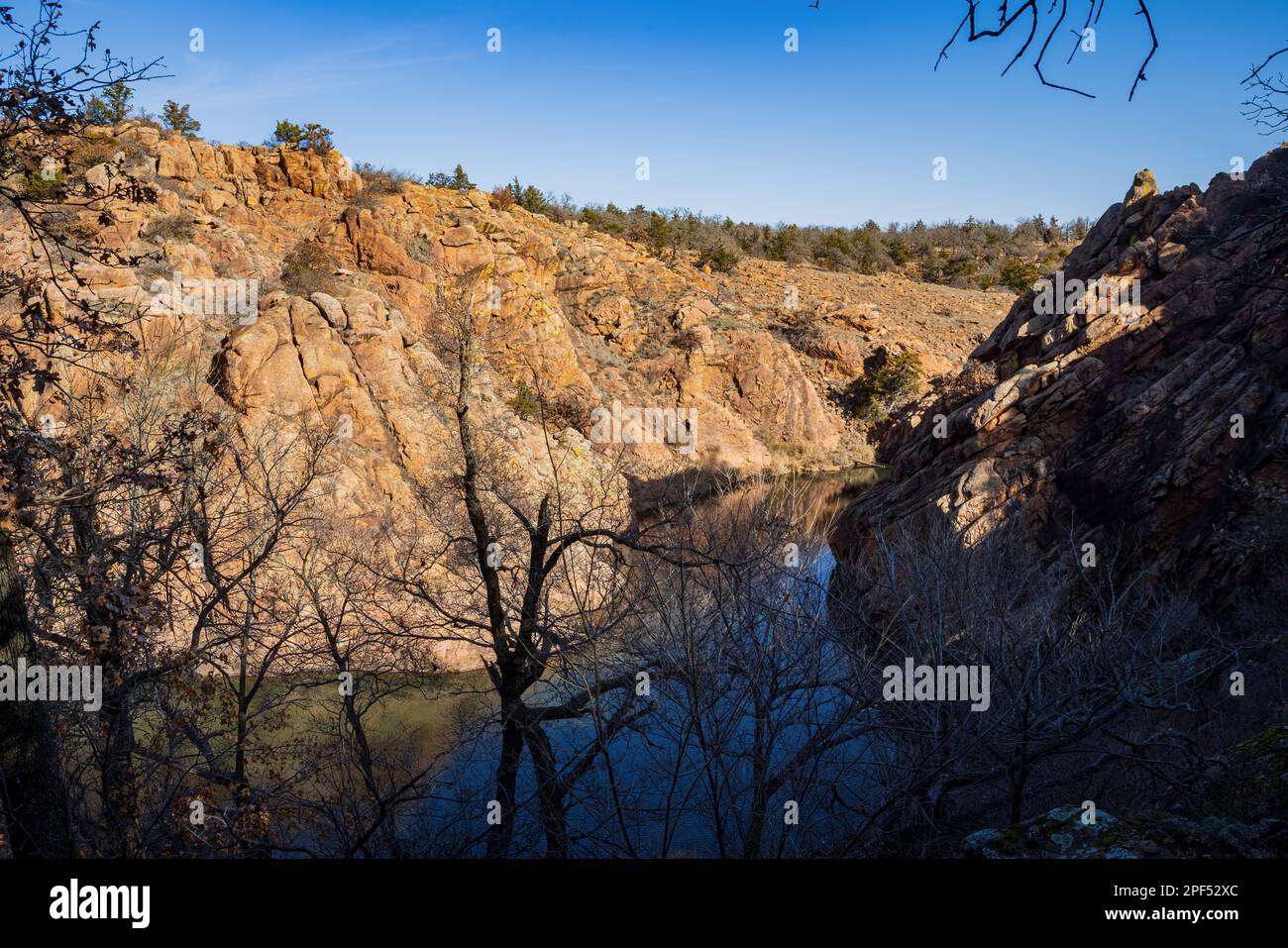 Sunny view of hiking in the Narrows Trail of Wichita Mountains National