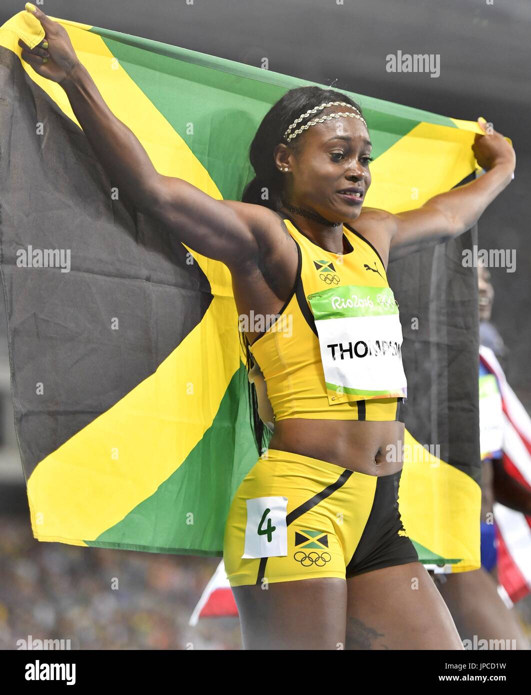 Jamaican sprinter Elaine Thompson celebrates with her country #39 s flag