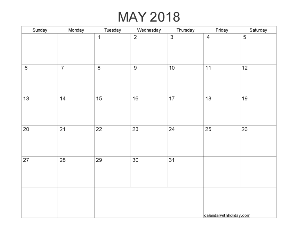 Blank Calendar May 2018 Printable 1 Month Calendar Template in Blank