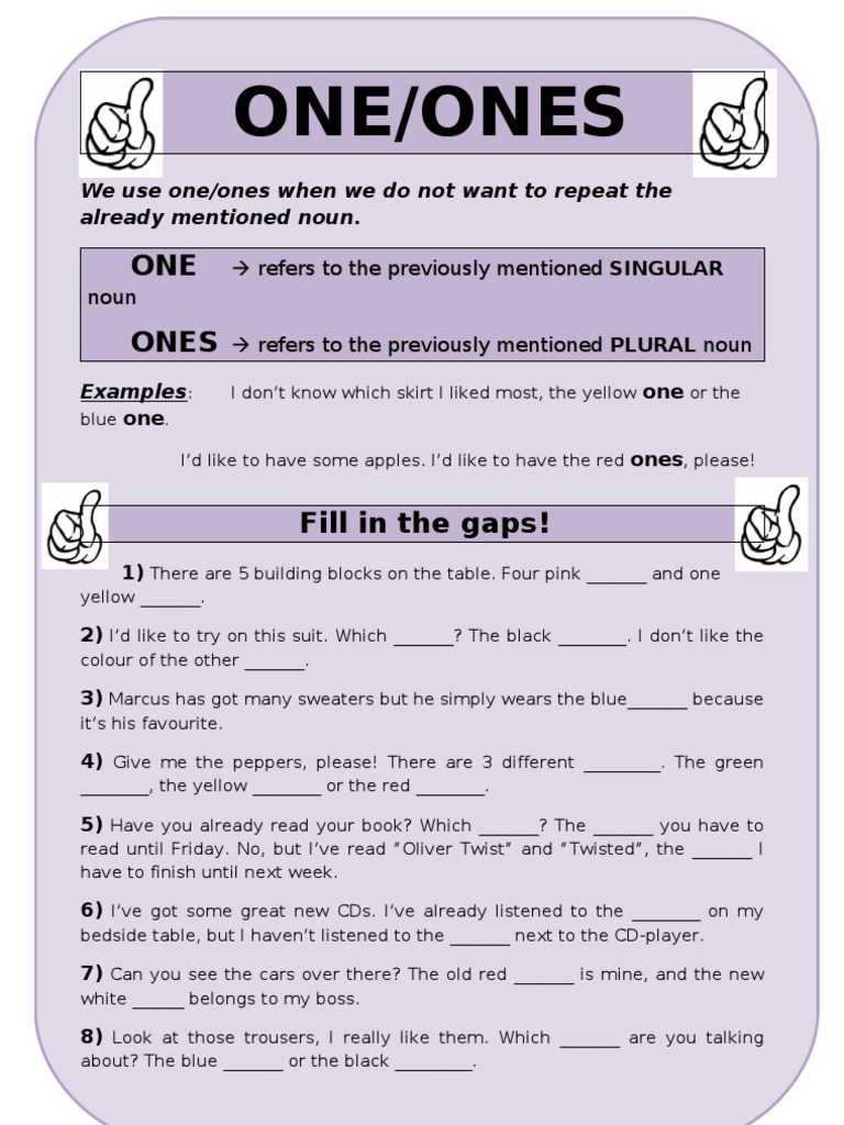 One vs Ones English grammar fill in the blanks exercises with