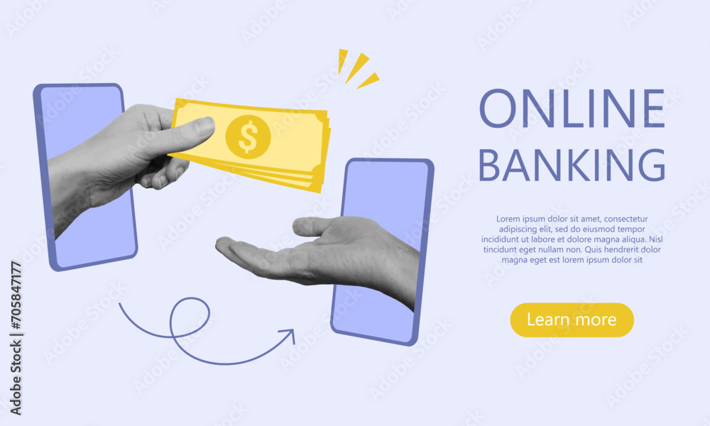 Online Banking Template with Cut Out Two Hands Pass Each Other Money