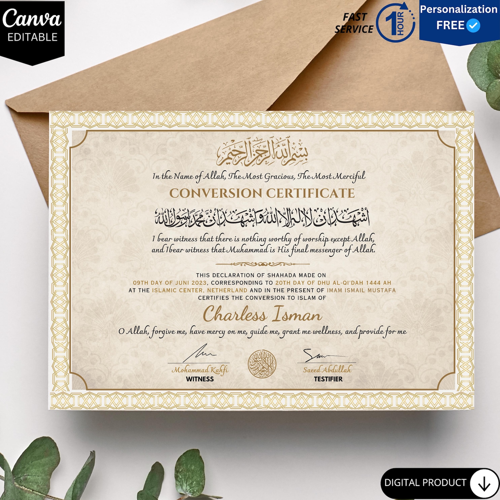 Islam Conversion Certificate Personalized Digital Shahada Certificate