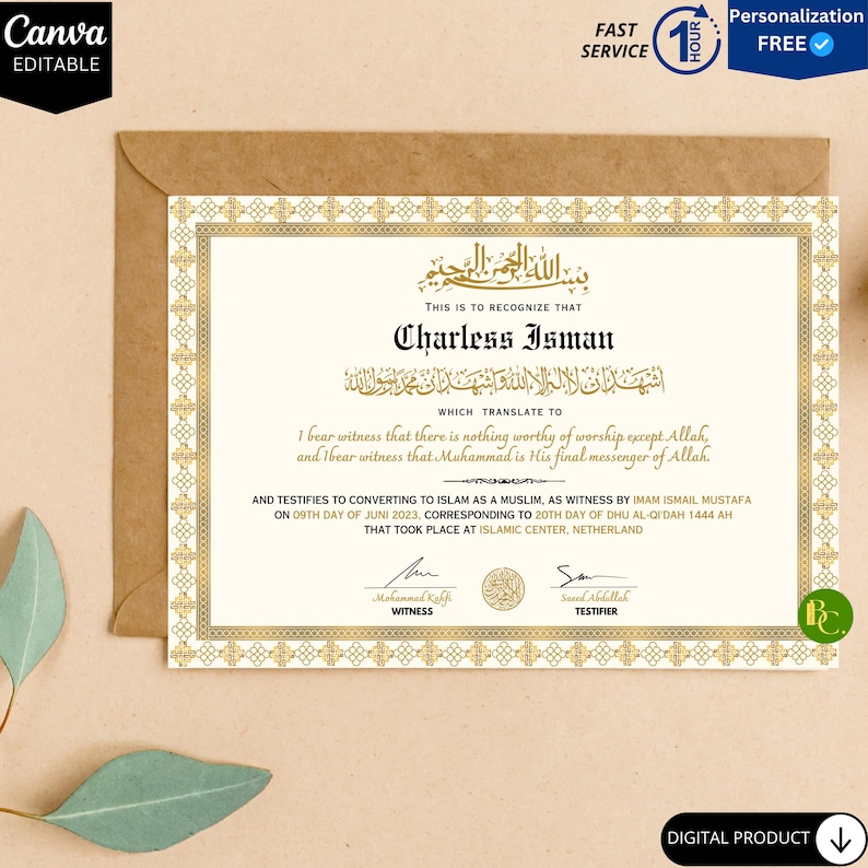 Shahada Certificate Editable Islam Conversion Certificate Islam