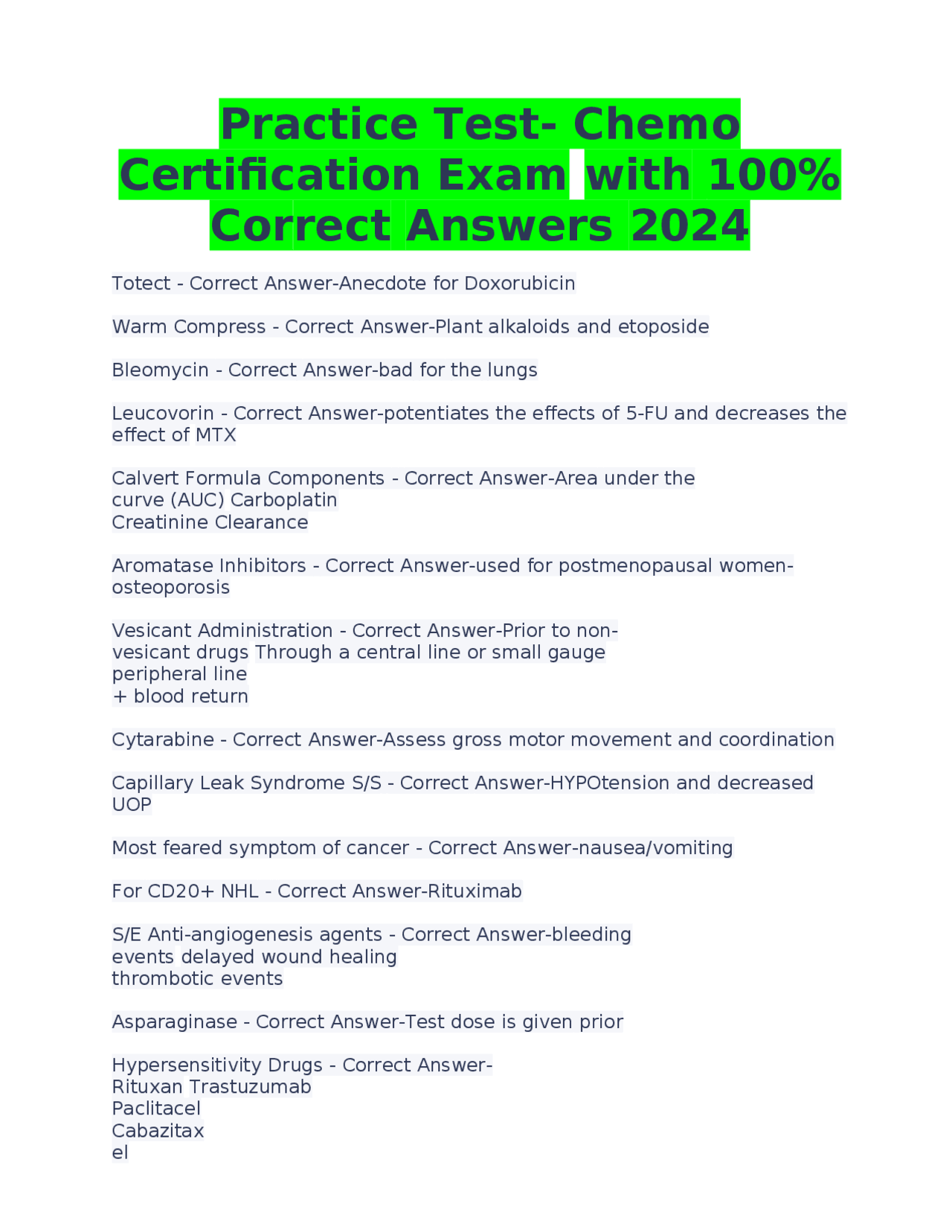 Practice Test Chemo Certification Exam Questions With Correct Answers