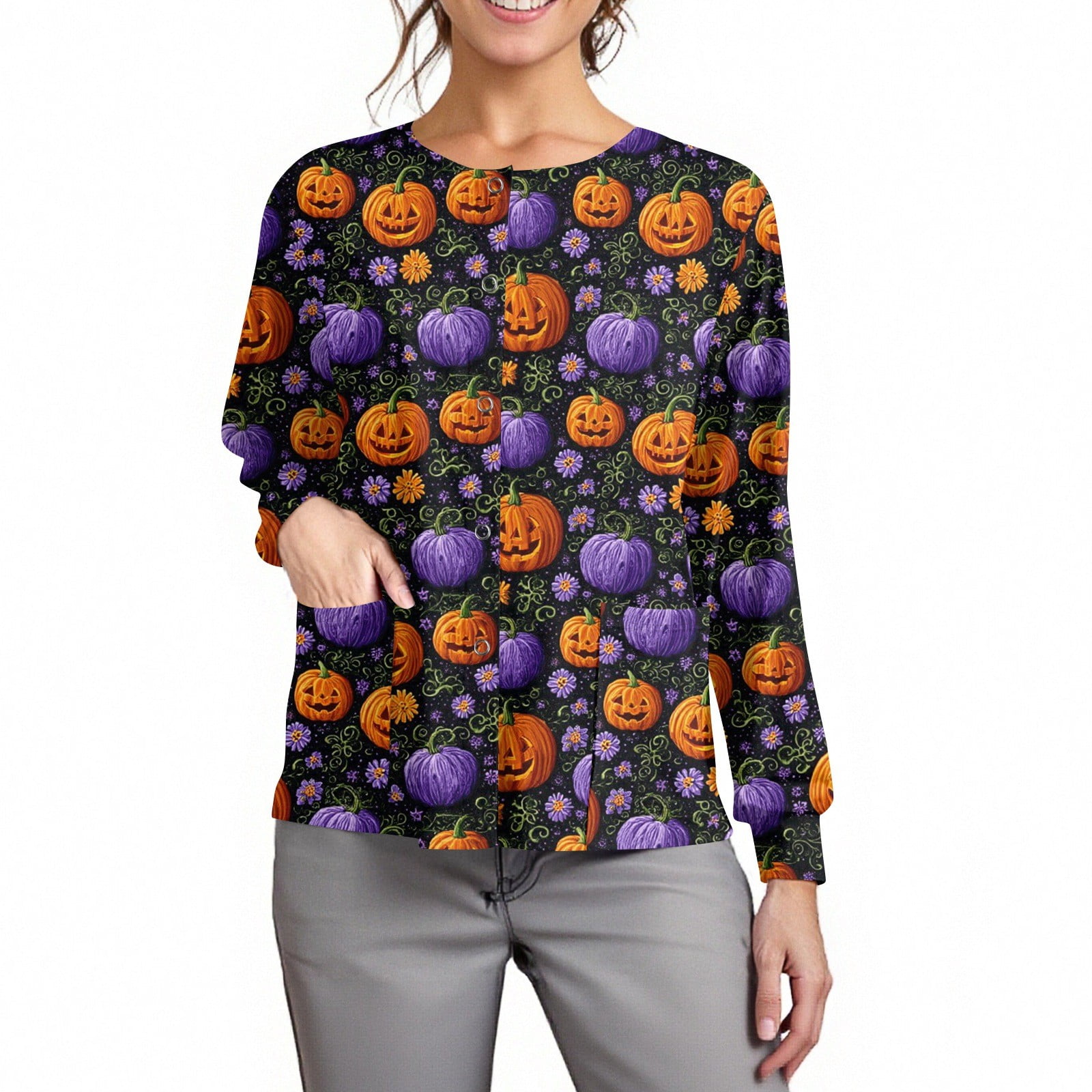 Halloween Cardigan for Women Long Sleeve Open Front Pumpkin Bat Print