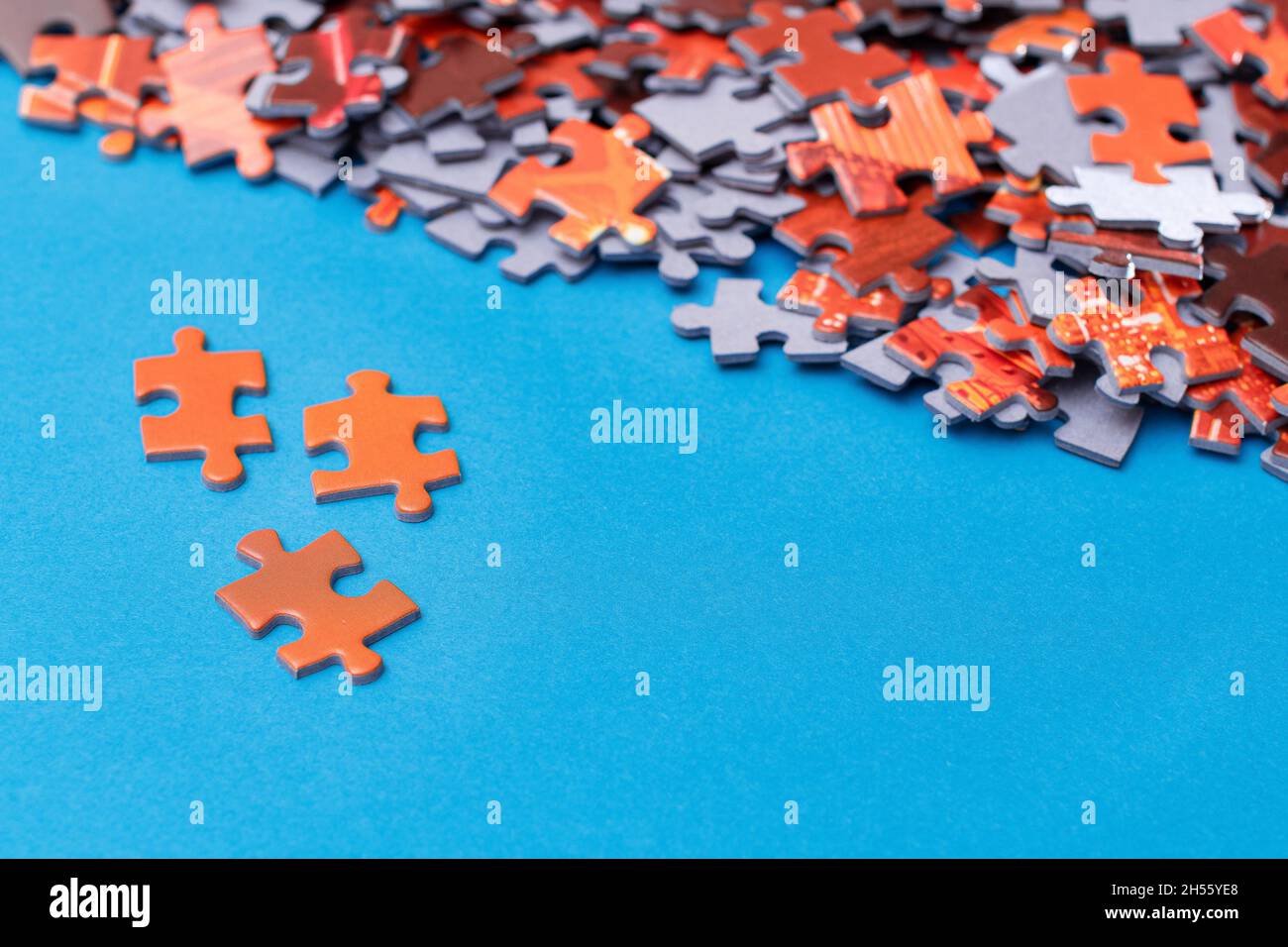 Mixed Peaces of a Colorful Jigsaw Puzzle Lie on the Blue Background