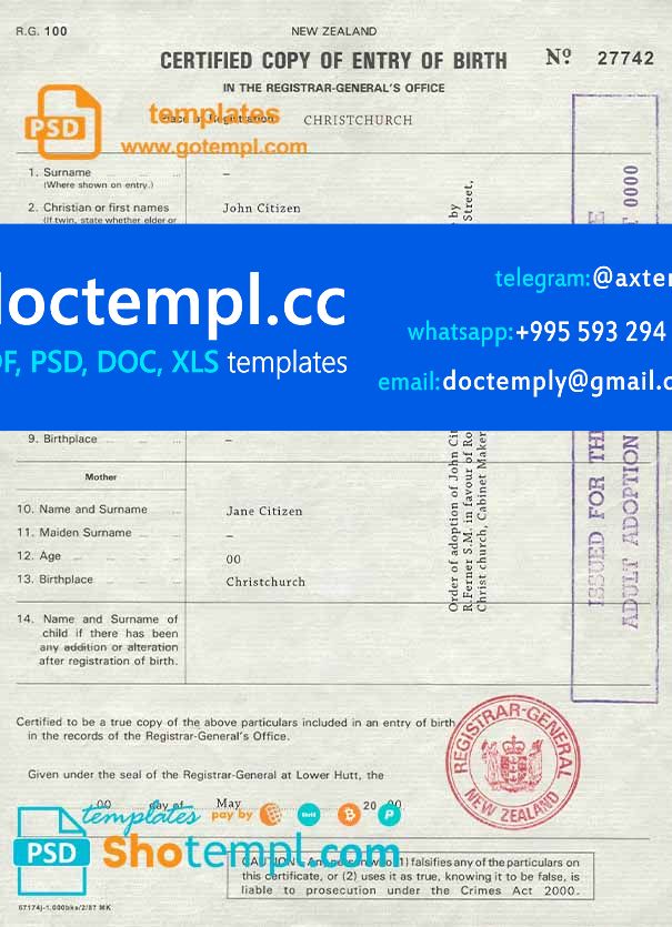 New Zealand birth certificate PSD example completely editable Mytempl