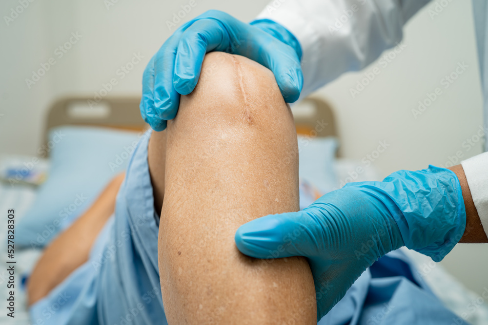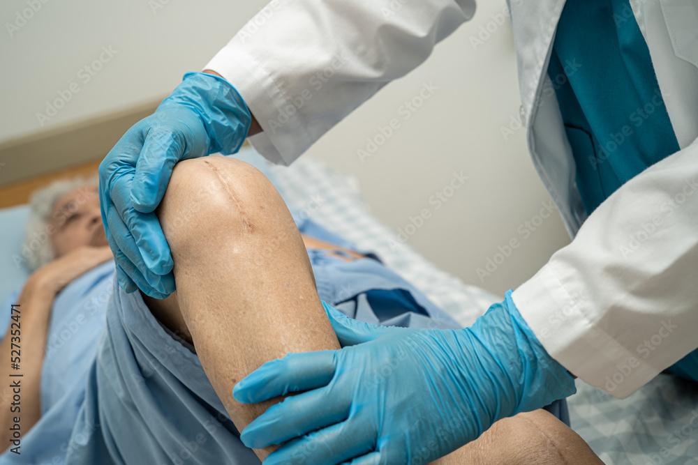 Doctor checking Asian elderly woman patient with scar knee replacement