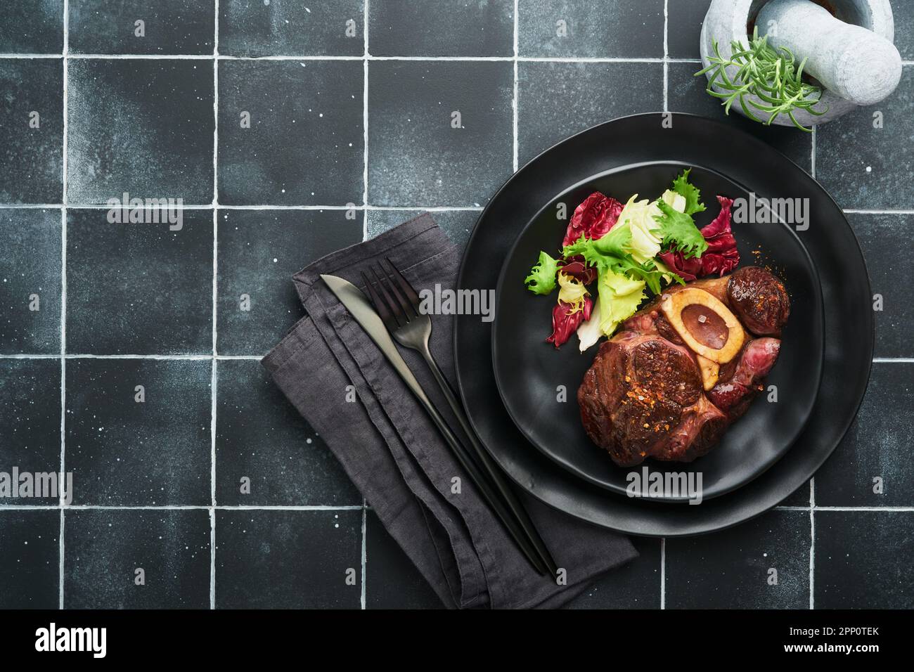 Raw Osso Buco Meat with Seasonings on Dark Stone Background Stock Photo