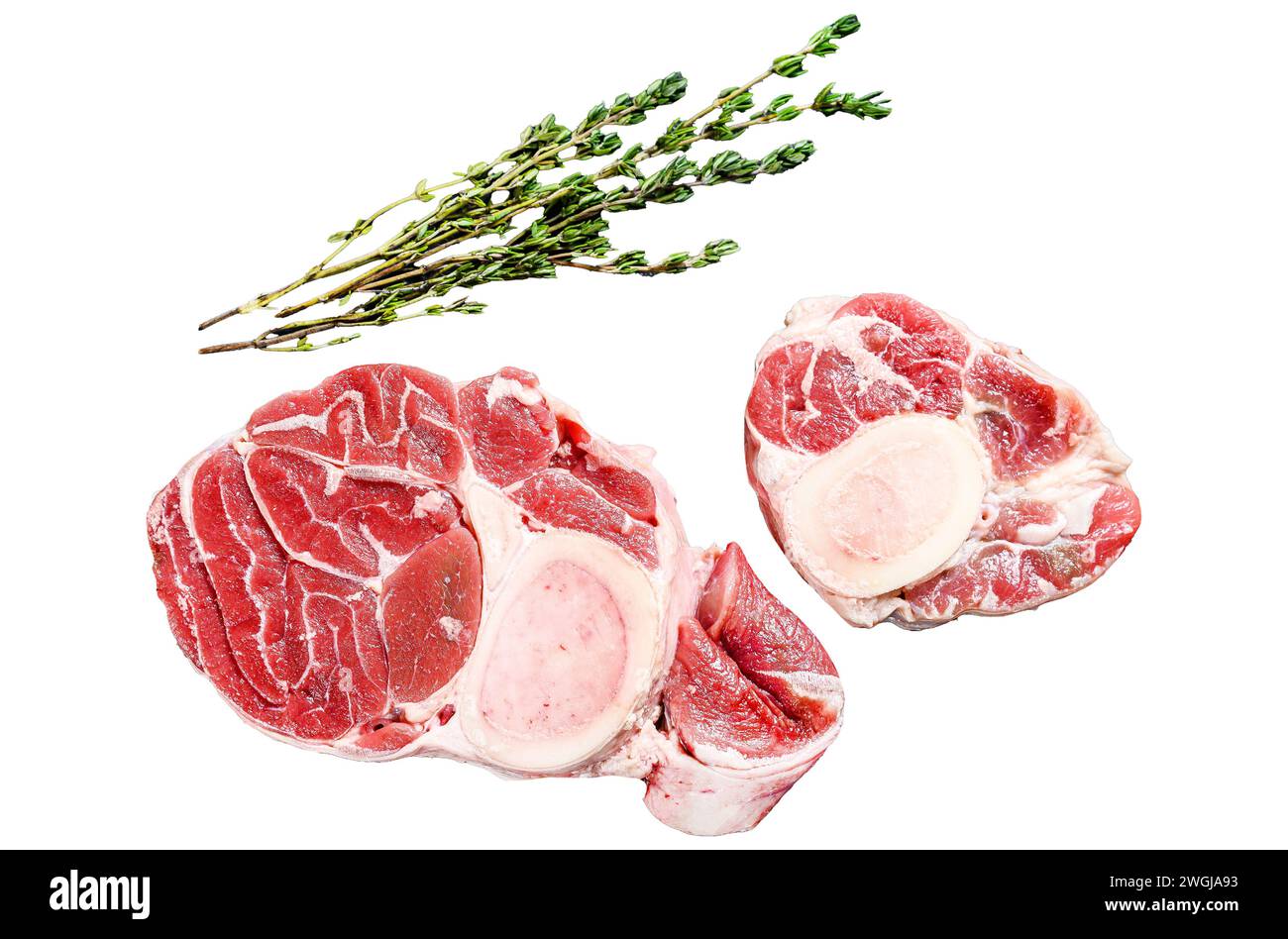 Raw fresh ossobuco con with herbs osso buco meat Isolated on white