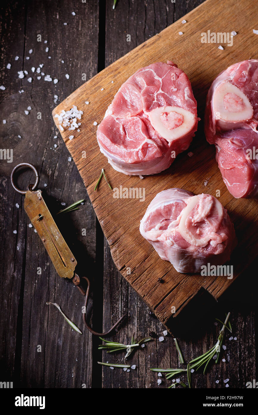 Raw osso buco meat on wooden cutting board with vintage steelyard salt