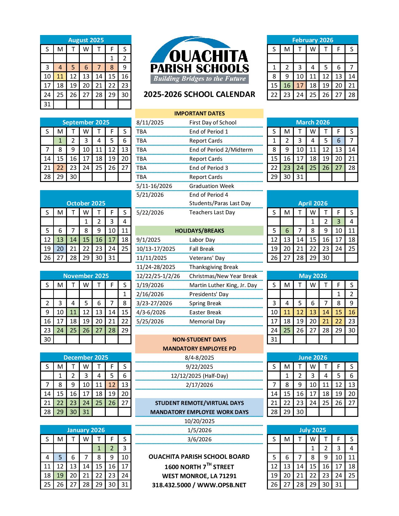 Ouachita Parish School Calendar 2025 2026 Download PDF