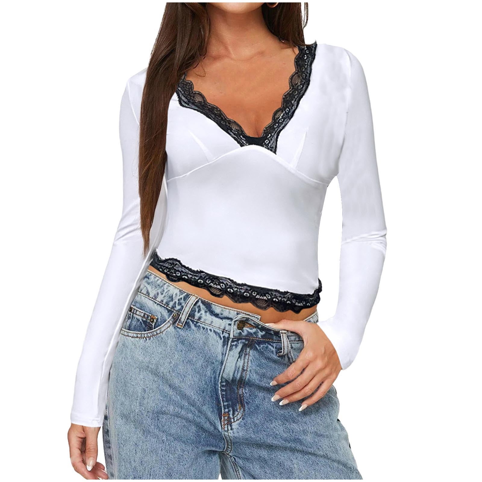 Chbgutlmr Crop Tops for Women Lace Patchwork Deep V Neck Slim Casual