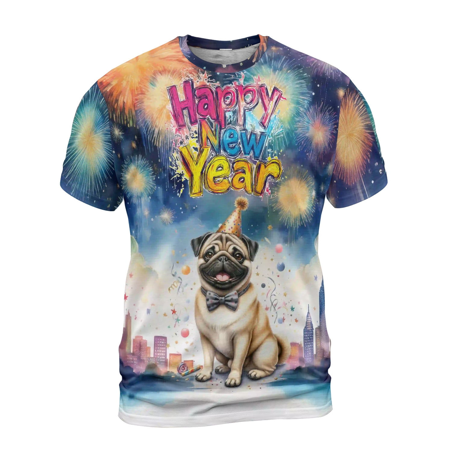 Happy New Year with Pug Fireworks Holiday Xmas Winter 2025 All Over