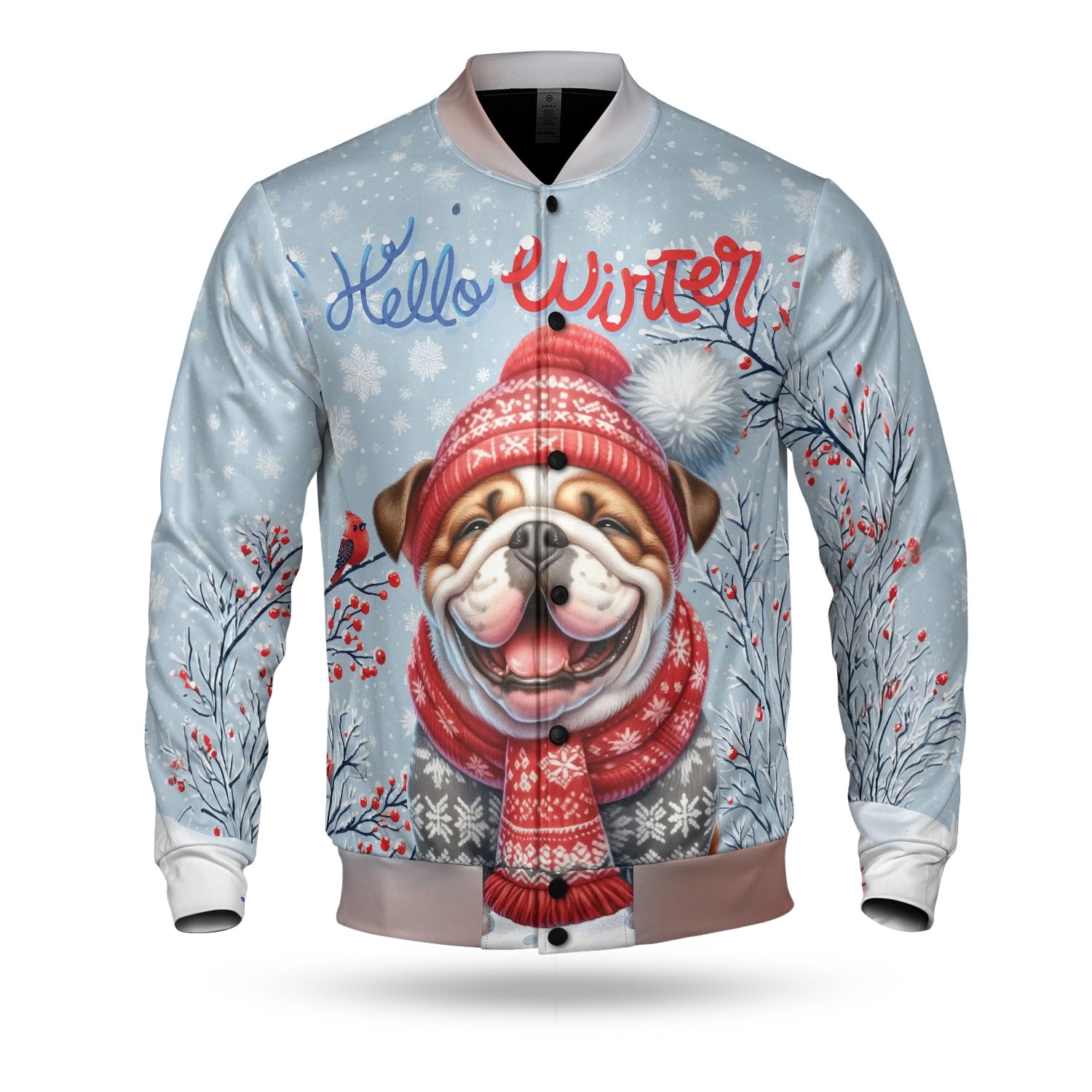 Hello Winter Bulldog Smiling in Red Scarf Hat Welcome Christmas All